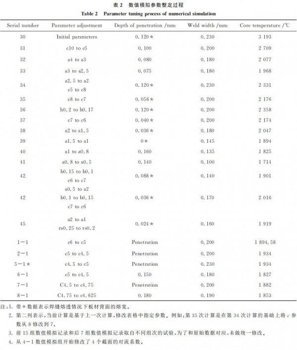 以上文初始參數作為(wei) 數值仿真初始熱源參數,以焊接試驗得到的焊縫截麵形貌為(wei) 仿真目標,截取焊縫中長寬高為(wei) 5mm×3mm×0.2mm 的部分作為(wei) 研究對象,采用圖8所示基於(yu) 試錯法的參數整定策略,借助 ABAQUS數值模擬軟件,對焊接過程進行數值模擬。熱源參數整定結果如表3和第4列和第8列所示,取316L不鏽鋼材料熔點為(wei) 1450 ℃, 焊縫形貌數值模擬結果如圖9所示,數值模擬結果和上文所示激光焊接試驗得到的焊縫截麵形貌相符合。截取其中部分數值模擬過程如表2所示,在數值模擬過程中熔深、熔寬和核心溫度的變化趨勢與(yu) 上文中熱源模型的函數規律相符。