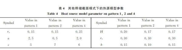 在焊接過程數值模擬研究中,可以得到焊縫截麵形貌的四種模式如圖10所示。模式3如圖10(c)所示,為(wei) 本研究的目標焊縫模式,可以較好地模擬金屬雙極板半熔透激光焊接的焊縫形貌。模式1如圖10(a)所示,焊縫深寬比較小,該模式可以用於(yu) 表麵激光淬火等表麵局部熱處理工藝的數值模擬。模式2如圖10(b)所示,表達了一種高貫穿焊接模式,其焊縫上表麵名義(yi) 直徑和焊縫背麵名義(yi) 直徑比為(wei) 2左右。在激光加工領域,可以較好地表達高脈衝(chong) 峰值,超短脈衝(chong) 寬度的皮秒、飛秒激光超微細加工過程。模式4如圖10(d)所示,在焊接試驗中,加大焊接峰值功率,模式3會(hui) 轉換成模式4。金屬雙極板焊接工藝中,結構焊接可以采用該模式。模式1、模式2、模式4所對應的熱源模型參數記錄在表4中。