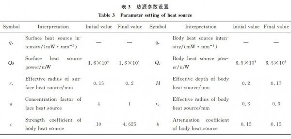 公式(2)與(yu) 公式(5)所對應的熱源模型中的參數與(yu) 實際焊接參數有關(guan) 聯,明確熱源模型參數與(yu) 實際 參數之間的關(guan) 係是熱源模型參數整定工作的基礎。定義(yi) 激光焊接參數中(見表1)峰值功率為(wei) Pp,頻率為(wei) F,脈衝(chong) 寬度為(wei) Wp。熱源模型中各個(ge) 參數的標識如表3所示。熱源模型中的麵熱源功率與(yu) 體(ti) 熱源功率之和為(wei) 激光輸入的平均功率,平均功率與(yu) 峰值功率、頻率、 脈衝(chong) 寬度之間的關(guan) 係如公式(6)所示。代入表1中 的3個(ge) 參數值,計算得出所需平均功率為(wei) 81W。綜合考慮短脈衝(chong) 激光的穿透性能,設麵熱源功率初始值為(wei) 16W,體(ti) 熱源功率初始值為(wei) 65W。