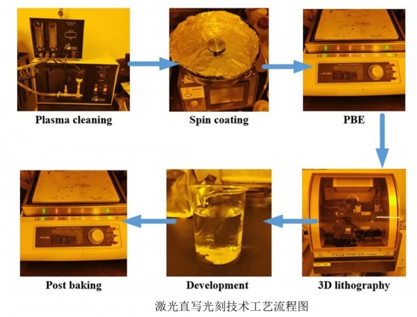 這些技術具體(ti) 包括有襯底表麵處理技術、光刻膠旋塗技術、光刻膠前烘技術、激光直寫(xie) 光刻曝光技術、顯影以及後烘(PBE)技術。具體(ti) 的流程如下圖所示。