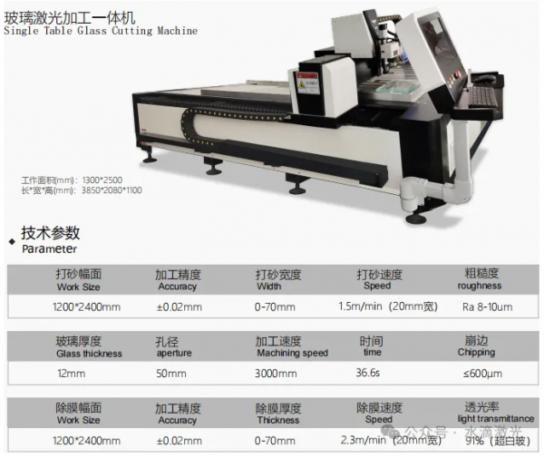 設備集成一體(ti) 化加工,除了激光打砂外、還可用於(yu) 激光除膜、激光打孔、激光刻蝕等多種工藝的玻璃加工中: