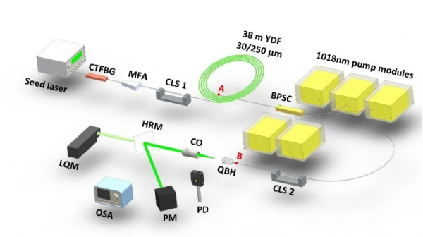 激光器係統結構示意圖如圖1所示,1080 nm種子激光經傾(qing) 斜光柵(Chirped and tilted fiber Bragg grating, CTFBG)、模式適配器(Mode field adaptor, MFA)和包層光濾除器(Cladding light Stripper, CLS 1)後進入YDF。YDF纖芯直徑和數值孔徑分別為(wei) 30 μm和0.06,內(nei) 包層直徑和數值孔徑分別為(wei) 250 μm和0.46,泵浦光吸收係數約為(wei) 0.4 dB/m@1018nm,YDF長度約38 m。1018 nm泵浦激光通過(6+1)×1後向泵浦信號合束器(Backward pump and signal combiner, BPSC)注入YDF。放大後的信號光經包層光濾除器(CLS 2)和端帽(Quartz block holder, QBH)輸出。為(wei) 實時監測激光器特性,輸出激光經準直器(Collimator, CO)後由反射率大於(yu) 99.99%的高反鏡(Highly reflective mirror, HRM)進行分束。微弱的透射光進入光束質量儀(yi) (Laser quality monitor , LQM),反射的高功率激光經進入功率計,散射光進入光譜儀(yi) (Optical spectrum analyzer, OSA)和光電探測器(Photodetector, PD)。