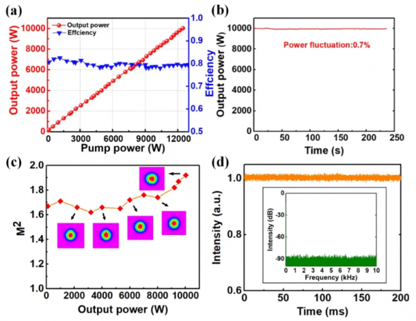 圖2 光纖激光器輸出特性。(a)輸出功率隨泵浦功率的變化;(b)輸出功率10.03 kW時的功率波動測試結果;(c)不同輸出功率下的光束質量;(d)最高輸出功率下的時序和傅裏葉變換頻譜