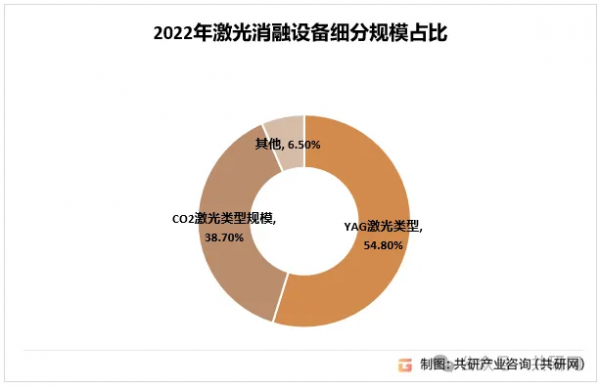 2022年激光消融設備規模32.01億(yi) 元,YAG激光類型規模17.54億(yi) 元,YAG光類型規模占比54.8%,CO2激光類型規模12.39億(yi) 元,CO2激光類型規模占比38.7%。