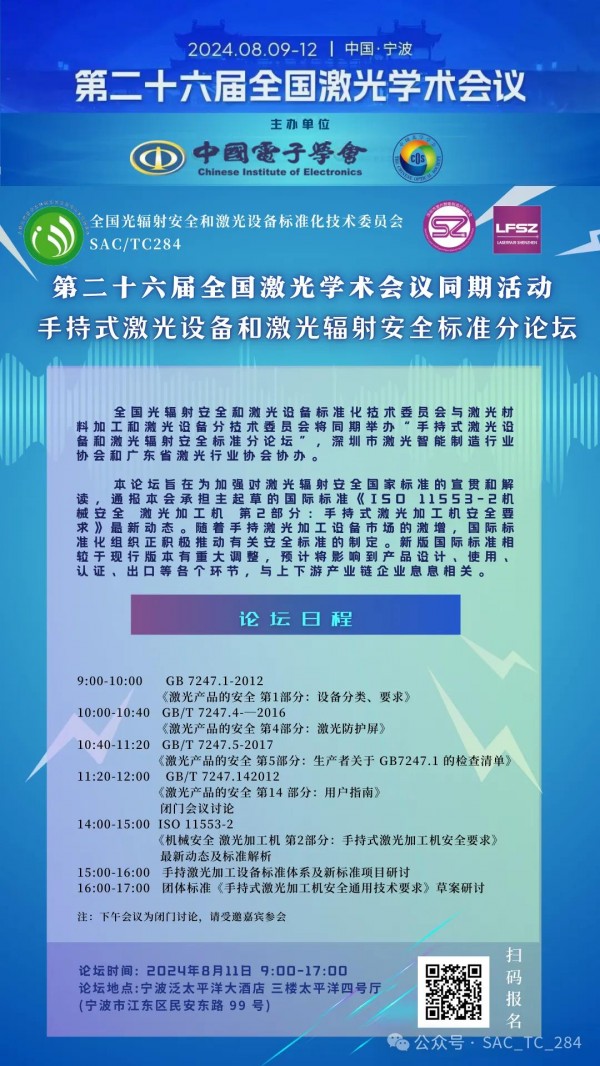 全國光輻射安全和激光設備標準化技術委員會(hui) 與(yu) 激光材料加工和激光設備分技術委員會(hui) 將同期在第二十六屆全國激光學術會(hui) 議舉(ju) 辦GB7247係列國家標準宣貫和“手持式激光設備和激光輻射安全標準分論壇”,深圳市激光智能製造行業(ye) 協會(hui) 和廣東(dong) 省激光行業(ye) 協會(hui) 協辦。