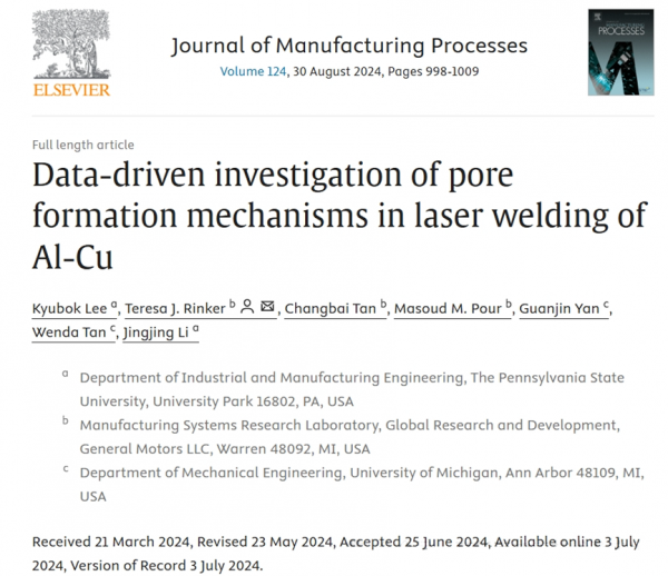 來自美國的研究團隊Kyubok Lee等人在Journal of Manufacturing Processes國際雜誌上發表文章Data-driven investigation of pore formation mechanisms in laser welding of Al-Cu。