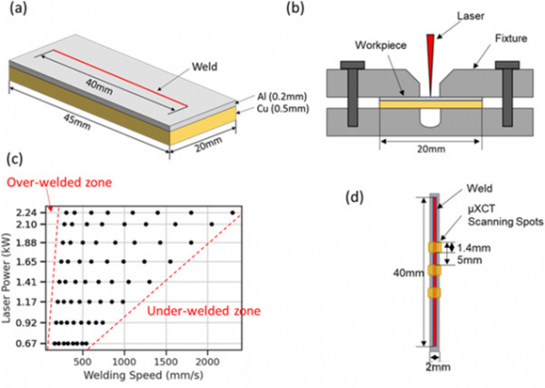 圖1. 鋁和銅的激光焊接:(a)試樣幾何形狀示意圖;(b)焊接夾具示意圖;(c)工藝窗口設計及工藝參數設定分布;(d)μXCT掃描的樣品幾何結構示意圖。