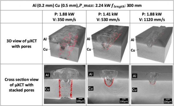 該研究旨在通過將三維(3D)氣孔的分布數據分析和流體(ti) 動力學(CFD)模擬分析相結合,對Al-Cu異種金屬激光焊接中的氣孔形成機理進行全麵研究。為(wei) 實現這一研究目標,采用四步方法:首先,通過μXCT掃描獲取三維氣孔特征數據,並利用氣孔表征和聚類進行定量氣孔生成數據分析。其次,利用分析得到的三維氣孔數據,對Al-Cu異種金屬激光焊接過程中工藝參數與(yu) 氣孔形成進行相關(guan) 性分析,從(cong) 而研究其工藝-結構關(guan) 係。然後,通過CFD模擬研究了影響氣孔形成機理過程與(yu) 結構關(guan) 係的調控機理。最後,通過CFD模擬將不同工藝參數對應的工藝物理特性的變化與(yu) 氣孔分布的變化聯係起來,探索了工藝參數與(yu) 氣孔形成機理之間完全相關(guan) 性所需的物理屬性。