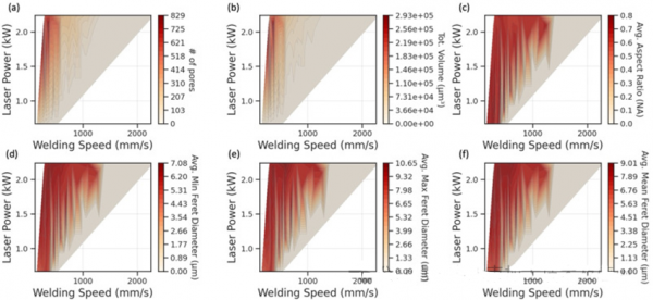 圖3. 等值線圖描繪了一係列工藝參數範圍內(nei) 氣孔數的變化:(a)氣孔數,(b)總體(ti) 積,(c)平均長徑比,(d)平均最小孔直徑,(e)平均最大孔直徑,(f)平均孔直徑。