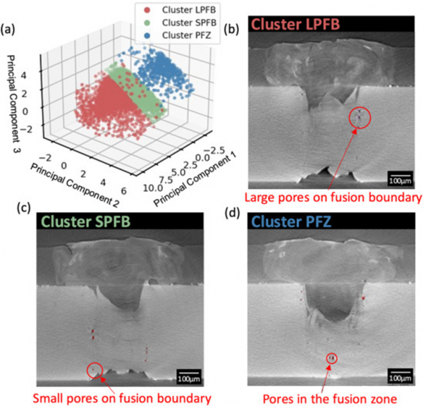 圖4. 氣孔團聚結果:(a)主成分1和主成分2的團聚分布;(b)、(c)、(d)最具代表性的分別是團簇LPFB(熔合邊界大氣孔)、團簇SPFB(熔合邊界小氣孔)和團簇PFZ(熔合區域內(nei) 氣孔)。