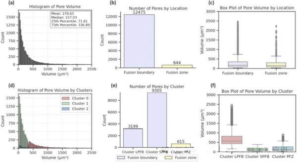 正態分布,表明數據集中在較小的氣孔(圖6(a))。圖6(b)和(c)顯示了基於(yu) 氣孔位置(熔合邊界或熔合區)的氣孔數量和體(ti) 積分布。融合邊界處的氣孔數量明顯高於(yu) 在融合區觀察到的氣孔數。此外,氣孔位置對體(ti) 積影響不顯著。圖 6(d)表示每個(ge) 聚類的體(ti) 積直方圖,顯示每個(ge) 聚類保持左偏態對數正態分布。數據也表明,團簇LPFB和SPFB根據氣孔體(ti) 積有明顯的區分,而團簇PFZ則具有獨立的分布。圖 6 (e) 顯示了每個(ge) 簇中分類的氣孔數量及其位置。數據顯示,聚集在PFZ簇中的大多數氣孔源自位於(yu) 融合區的氣孔,而簇LPFB和SPFB則由位於(yu) 融合邊界的聚集氣孔組成。圖6(f)顯示了每個(ge) 團簇的氣孔體(ti) 積分布。觀察到 LPFB 和 SPFB 簇之間的體(ti) 積分布存在明顯差異,表明它們(men) 基於(yu) 體(ti) 積和大小特征的區別。