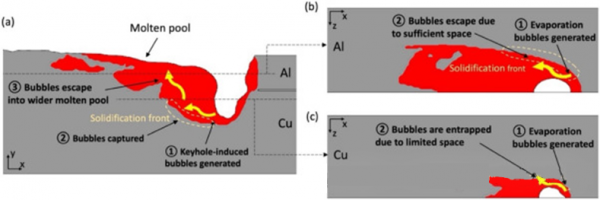 圖7總結了Al-Cu異種金屬激光焊接中觀察到的氣孔生成機製。當在鎖孔底部形成的氣泡跟隨材料流動,最終到達熔池末端的凝固前沿,當氣泡被捕獲時,就會(hui) 產(chan) 生鎖孔誘導的氣孔。該過程導致在融合區內(nei) 產(chan) 生氣孔。
