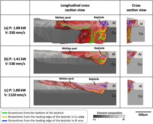 圖6(b)為(wei) 三維CFD 仿真的縱向視圖。在圖中,綠色的流線代表從(cong) 鑰匙孔底部產(chan) 生的氣泡的運動。可以通過綠色流線觀察到三種類型的氣泡運動模式。首先,氣泡回流並到達Cu區域的凝固前沿,形成鎖孔誘導的氣孔。其次,氣泡未能到達凝固前沿,從(cong) Cu區的熔池中逸出的氣泡無法到達Al區後方形成的凝固前沿,而在表麵破裂。第三,氣泡被鑰匙孔重新吸收。在這種氣孔生成機理機製下,隻有到達Cu區域凝固前沿的氣泡才會(hui) 在Cu區域形成鎖孔誘導的氣孔,將其歸類為(wei) 團簇PFZ。