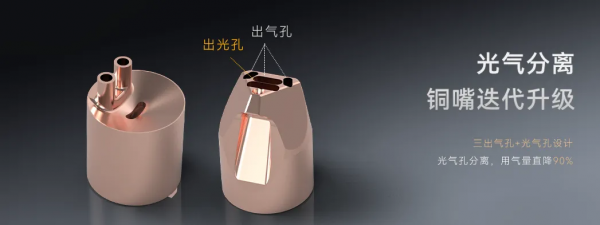 K1M一改過往激光“光氣同軸”的固化思維,創意性采用“光氣分離技術”,銅嘴升級為(wei) “三氣孔+一出光孔”設計,將原來那把“氣刀”改為(wei) “氣保護”。過去光氣同軸的機理是在切割或焊接時要使用輔助氣體(ti) 把熔化的液態金屬給吹掉,而現在更像一床被子保護好焊道,使得用氣量大幅下降,將現有焊機用氣量15L/min降至1L/min,用氣量直降90%,且實現的焊接效果更好。這樣的光氣分離技術方能保證小型化內(nei) 置製氮係統能夠滿足日常焊接需求。