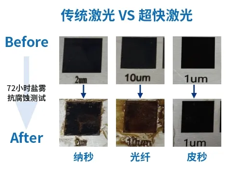 在工業(ye) 製造領域,激光標記技術在實現各種材料的耐用和精確標記方麵起著至關(guan) 重要的作用。本文對納秒、皮秒及光纖三種不同激光源在316不鏽鋼上的黑色標記性能進行了比較分析,重點展示了其在鹽霧測試和掃描電子顯微鏡 (SEM) 分析下的表現。