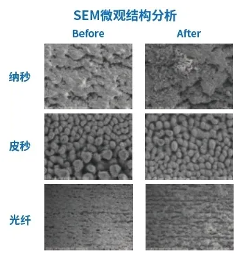激光打黑的SEM分析 為(wei) 了解皮秒激光在不鏽鋼上創建抗腐蝕黑色標記的優(you) 越性能,使用掃描電子顯微鏡 (SEM) 進行了詳細的微觀結構分析,分析了鹽霧測試前後的標記。 SEM圖像揭示了以下幾個(ge) 關(guan) 鍵方麵,突出了皮秒激光標記的優(you) 勢: 最小的熱影響區 (HAZ) SEM圖像顯示與(yu) 其他激光相比,熱影響區明顯較小,表明標記區域周圍的熱應力最小。這種材料表麵結構的保留有助於(yu) 維持其抗腐蝕性能。 增強的微觀結構穩定性 精細且精確的能量傳(chuan) 遞可以更好地保留不鏽鋼的微觀結構,使其固有的抗腐蝕性能優(you) 於(yu) 納秒激光和光纖激光。 氧化層的形成 皮秒激光的快速能量傳(chuan) 遞導致表麵形成薄且均勻的穩定氧化層,增強了不鏽鋼的抗腐蝕性能。 無汙染表麵 皮秒激光創建的標記顯示出清潔且無汙染的表麵。沒有熔融材料和碎屑的存在,確保了更穩定和耐腐蝕的標記。 通過鈍化測試 美國AOC應用團隊的不鏽鋼超快激光黑色標記成功通過了ASTM A967標準鈍化測試。