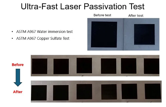 本實驗主要評估了三種類型的激光器: FOTIA 激光器(納秒-UV-355nm) AMT 激光器(皮秒-IR-1064nm) 光纖激光器(納秒-IR-1064nm) 網格測試方法樣品在不同的點光柵尺寸下進行了黑色標記,確保了垂直和水平方向上點間距的均勻性。填充間距決(jue) 定了垂直間距,而水平間距則基於(yu) 掃描速度除以重複頻率計算。 抗腐蝕測試和鈍化測試 樣品經過鹽霧測試和ASTM A967標準鈍化測試。鹽霧測試使用BEMCO P700台式鹽霧環境室,使用5%濃度的鹽溶液,在5 PSIG的恒定溫度下進行,測試持續72小時,以模擬持續的高壓、高溫和鹽霧的惡劣環境。 鈍化測試嚴(yan) 格遵守美國ASTM A967標準,這是一種不鏽鋼零件化學鈍化處理的標準規範。該過程通過去除表麵的遊離鐵形成保護性氧化層,增強不鏽鋼的抗腐蝕性。