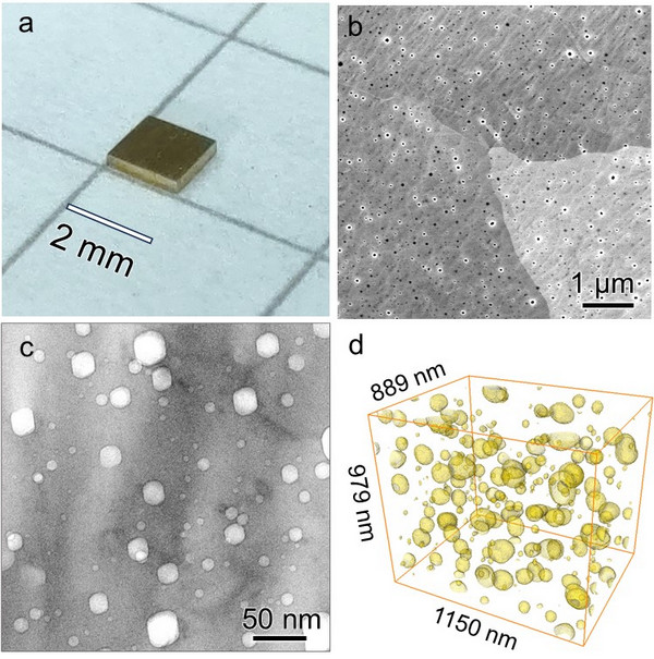 納米孔彌散強化金(NVD Au):(a)樣品實物圖;(b)典型掃描電鏡照片;(c)透射電鏡照片;(d)三維重構圖顯示納米孔的空間分布。