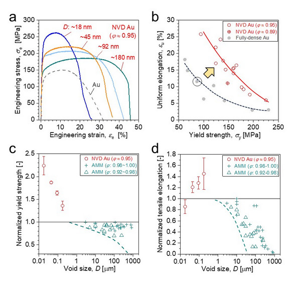 納米孔彌散強化金(NVD Au)的力學行為(wei) :(a)不同孔徑NVD Au以及全致密參比樣品的拉伸曲線;(b)兩(liang) 種樣品均勻延伸率隨屈服強度的變化;(c)屈服強度和(d)均勻延伸率隨孔徑的變化規律。AMM: 增材製造金屬材料。屈服強度和均勻延伸率均以相應全致密態樣品數據為(wei) 基準進行了歸一化。