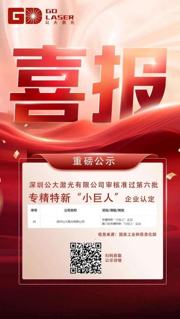 9月2日,工業(ye) 和信息化部發布工業(ye) 和信息化部認定的第六批專(zhuan) 精特新“小巨人”企業(ye) 公示名單,深圳公大激光有限公司 被評為(wei) 國家級專(zhuan) 精特新“小巨人”企業(ye) 。