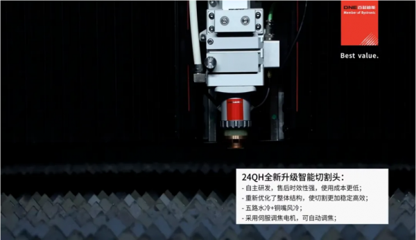 在功能部件上,通過瑞士百超研製的By-power切割頭,能夠更好地解決(jue) 長時間加工的問題。優(you) 化的熱管理和密封設計與(yu) 獨特的三驅冷卻係統(風冷、水冷、銅嘴冷卻),能夠保證切割頭在工作時避免因粉塵、高溫導致的鏡片汙染及焦點變化,確保加工穩定。同時,By-power切割頭憑借智能化的感應控製係統和手機實時監測、自動清潔、自動跟隨、自動避讓等功能,讓操作更加智能化、簡約化,大幅降低操作難度,提升生產(chan) 效率與(yu) 加工品質。