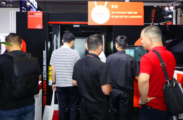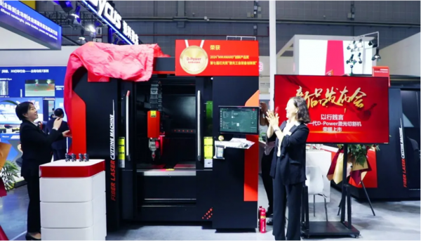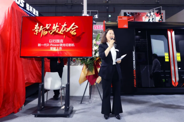 在熱烈的掌聲中,百超(深圳)副 CEO 顏春英和百超(深圳)銷售副總許紅敏共同為(wei) 新品揭幕。當紅色的幕布緩緩落下,新一代D-Power 激光切割機展現在眾(zhong) 人麵前,相比於(yu) 前代產(chan) 品,新一代D-Power激光切割機在產(chan) 品外觀上做出了優(you) 化,紅黑相間的線條設計整體(ti) 更具質感,也更能凸顯百超迪能品牌調性,在一眾(zhong) 激光加工設備中顯得格外醒目。