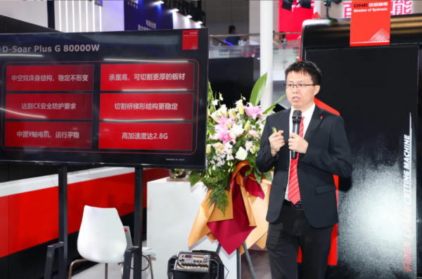 隨後,百超迪能產(chan) 品總監曹國棟對新一代D-Power 激光切割機及D-Soar Plus G 80000W 超高功率光纖激光切割機進行了技術講解。百超迪能產(chan) 品總監曹國棟詳細介紹了這兩(liang) 款產(chan) 品的技術特點和優(you) 勢,讓現場觀眾(zhong) 對百超迪能的最新技術有了更深入的了解。新一代D-Power激光切割機功率可達30kW,聯動定位速度可達150m/min,定位加速度可達1.5G,切割厚度可涵蓋0.8-80mm鋼材,電光轉換效率高達40%以上。這些亮眼的性能參數,使得D-Power激光切割機在工業(ye) 製造領域具有更為(wei) 廣泛的應用前景。