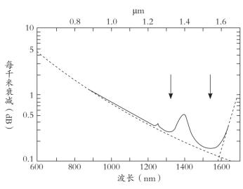 由於(yu) 數值範圍非常大,圖2顯示了光纖中衰減損耗的模式。最低損耗值出現在波長接近 1.5 微米的位置,此時曲線出現最低波穀。早期的光纖隻傳(chuan) 輸波長接近 1.3 微米的光,這受限於(yu) 當時的光源和探測器選擇,這個(ge) 波段的光損耗也出現了一個(ge) 波穀。現代材料比這裏使用的示例更加透明。兩(liang) 個(ge) 波穀之間出現吸收波峰,源於(yu) 纖維中殘餘(yu) 水的作用。圖上的曲線變化很明顯,但我們(men) 需要記住,影響因素是雜質(比如水),它可能隻占玻璃的百萬(wan) 分之幾。即使在損耗最大的波長下,它仍然是一種非常透明的玻璃,但我們(men) 要研究每千米的損失,而不僅(jin) 僅(jin) 是窗玻璃的厚度。
