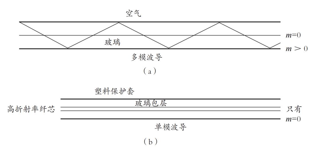 圖1 光可以在一塊玻璃或光纖內(nei) 彈跳。如果與(yu) 光的波長相比,光纖的纖芯較大,則有多個(ge) 可行的彈跳角度,稱為(wei) 模,寫(xie) 為(wei) m=0、m=1、m=2 等。此處為(wei) 了顯示效果而誇大了角度。對於(yu) 通信光纖,高折射率纖芯往往非常小,因此實際上光隻能以一種模式沿光纖直線傳(chuan) 播。