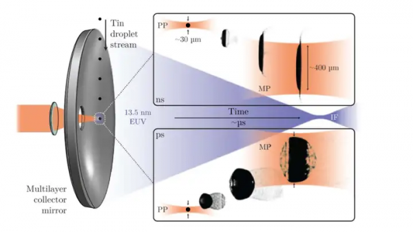 Cymer的LPP整體(ti) 方案顯得十分魔幻。首先選中了德國通快公司的極高功率CO2紅外激光,其波長是10.6um,最適合錫等離子體(ti) 通過逆韌致輻射吸收效應,吸收大量激光的能量,從(cong) 而有助於(yu) 升溫並電離。其次采用預脈衝(chong) 激光技術顯著提高EUV光源轉換效率。錫液滴的直徑為(wei) 20微米,而主脈衝(chong) 二氧化碳激光器光斑直徑至少為(wei) 幾百微米,為(wei) 了解決(jue) 液滴尺寸和激光光斑尺寸的不匹配問題,先用小功率預脈衝(chong) 激光照射錫液滴使其升溫膨脹,受光麵積變大。緊接著主脈衝(chong) 激光再次精確轟擊這個(ge) 餅狀的錫滴將其形成等離子體(ti) ,並產(chan) 生EUV輻射。為(wei) 了保證光源的連續性,1秒鍾需要精確“狙擊”5萬(wan) 個(ge) 20微米的錫液滴。這樣很容易將激發轉換效率從(cong) 1%提升到5%,也就是將EUV光源功率增加5倍。如果單純提升紅外激光器的功率,意味著要將40千瓦的紅外激光平均功率提升到200千瓦,那幾乎是不可能的任務。