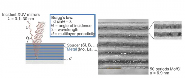 ASML光刻機中的布拉格反射器由蔡司研發,采用矽和鉬作為(wei) 主要原料,超過40層介質層,每層的厚度隻有不到4納米,而鍍膜的精度誤差不超過0.05納米,鍍膜技術由德國弗勞恩霍夫應用光學與(yu) 精密機械研究所提供。通過精確控製介質的厚度和組合,原本四散射出的極紫外線就可以集合起來,匯聚為(wei) 一束強的光線用於(yu) 生產(chan) 。
