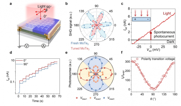圖1. a. 器件結構示意圖;b. MoTe2調控前後的偏振二次諧波測試結果;c. 器件在暗態和光照下的輸出特性曲線;d. 器件在0偏壓下的偏振光響應;e. 器件在不同偏壓下的偏振光響應;f. 在極性轉變點對應的偏壓處,器件的偏振探測比超過300