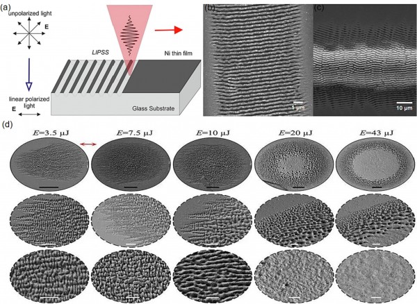圖1.(a)飛秒激光加工鎳薄膜示意圖。不同激光通量、脈衝(chong) 和掃描速度下的激光誘導周期性表麵結構(LIPSS):(b)0.17J/cm2,513nm,0.3mm/s;(c)0.25J/cm2,1026 nm,0.5mm/s。(d)飛秒激光輻照Bi2Te3的SEM圖像,脈衝(chong) 能量為(wei) 3.5μJ至43μJ,脈衝(chong) 數為(wei) 100。