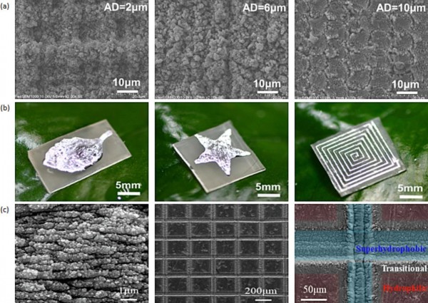 圖4.(a)飛秒激光處理後PDMS表麵的SEM圖像。(b)不同形狀的液態金屬圖案,如樹葉圖案、星形圖案和螺旋圖案。(c)通過飛秒激光燒蝕鈦表麵獲得的方形矩陣圖案結構的SEM圖像。