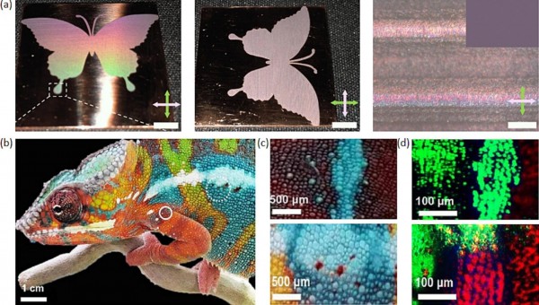 圖6.(a)從(cong) 不同方位角(垂直和水平)拍攝的飛秒激光處理過的銅表麵的照片和局部放大圖。 (b)變色龍的圖像。(c)變色龍皮膚的高倍放大圖像(與(yu) B中的圓圈部分相對應)。(d)仿生變色龍皮膚的全色熒光圖像。