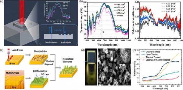 圖7.(a)飛秒激光加工AZO薄膜以形成可提高反射率的納米孔陣列示意圖。(b)原始AZO薄膜的透射率和相對透射率與(yu) 波長的函數關(guan) 係,以及飛秒激光加工後AZO薄膜的透射率和相對透射率。(c)飛秒激光誘導和熱氧化黃銅片示意圖。(d)飛秒激光誘導和熱氧化黃銅片表麵的照片和相應的SEM圖像。(e)用不同方法加工黃銅片後反射率的變化示意圖。