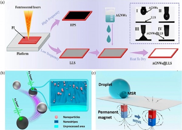 圖9.(a)飛秒激光在PI薄膜上製備的超疏水和超親(qin) 水表麵示意圖。(b)飛秒激光製備MSR的示意圖和MSR的理論表麵形貌。(c)MSR的工作原理示意圖,其中MSR可在磁場作用下進行液滴轉移。