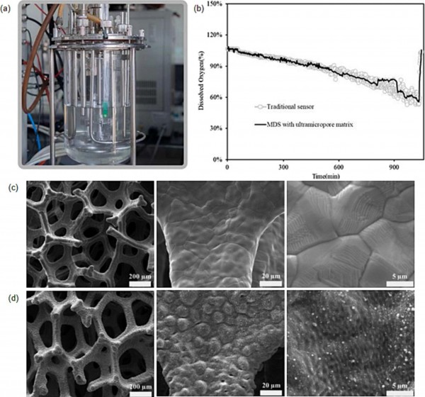 圖10.(a)實驗裝置中的MDS示意圖。(b)傳(chuan) 統傳(chuan) 感器與(yu) 超多孔基質MDS的溶解氧信號對比。(c)未加工的泡沫銅和(d)激光處理過的泡沫銅的SEM圖像。
