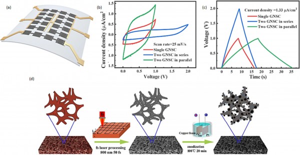 圖11.(a)柔性襯底上不同連接類型的集成石墨烯超級電容器(GNSC)示意圖。(b)GNSC在電壓掃描速率為(wei) 25 mV/s時的CV結果。(c)電流密度為(wei) 0.5mA/cm2時GNSC的GCD結果。(d)CuO/Cu超級電容器的製備工藝示意圖。