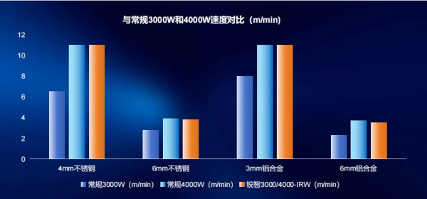 在工藝實測方麵,對比常規3000W激光器,銳智係列3000/4000-IRW平均速度提升超40%,其中在6mm鋁合金提升可達52%;對比常規4000W,銳智係列3000/4000-IRW與(yu) 之薄板切割速度基本持平。