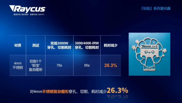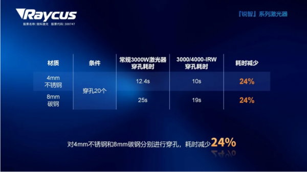 1、銳智係列技術優(you) 勢再度升級,製冷技術達天花板級別發布會(hui) 還推出了另一更為(wei) 重磅的係列新品——全新『銳智』係列激光器,除了延續輝智係列擁有的防結露抗凍、省電、高集成、接線簡單等之外,還進行了更多的技術及性能方麵的優(you) 勢升級,製冷技術更是達到了天花板級別。其他優(you) 勢可歸結為(wei) :(1)製冷天花板,超穩內(nei) 核:采用智能冷卻係統隨動控溫,保證激光器內(nei) 部、外殼,外光路始終幹爽不結露;采用低溫相變冷卻,相比常規水冷,可降低30℃,整機的電光轉化效率和可靠性也大幅度提升。(2)硬實力升級,速度躍升:激光器除了擁有常規的連續/脈衝(chong) 模式之外,還擁有QCW和F模式,尤其是F模式在實際加工中可使出光功率高度接近於(yu) 4000W,從(cong) 而擁有更高效的加工能力,此外,相比常規4000W激光器+水冷機也更為(wei) 省電,每小時可省6度電,一年可省一台激光器。銳智係列的激光器可廣泛應用於(yu) 精密切割、金屬劃線、薄板穿孔、金屬焊接和表麵處理等領域,在切割、穿孔能力上相比常規激光器具有十分明顯的優(you) 勢。2、銳智係列性能大躍升,切割能力平均提升超40%,穿孔提升24%,複雜圖形穿孔、切割提升26.3%