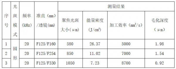 圖1 旗幟版P1000H-P脈衝(chong) 激光器表1為(wei) 不同透鏡下P1000H-P鋁殼毛化對應的能量密度和毛化深度,從(cong) 表中的數據可以看出,P1000H-P毛化深度大於(yu) 1.5μm時,最大光斑為(wei) 850μm,加工頻率為(wei) 20K,此時不考慮振鏡折返,1S內(nei) 理論加工麵積為(wei) 0.85×0.85×20×103=14.45×103mm/s。當要求毛化深度為(wei) 0.92μm,光斑為(wei) 1050μm,效率可達8700mm2/s。客戶可根據企業(ye) 需求,選擇合適的參數進行相應加工。