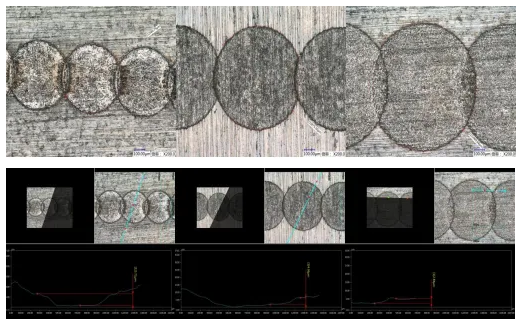 表2為(wei) P1000H-P與(yu) 某進口激光器毛化效果對比,設置兩(liang) 組點距和線距分別為(wei) 0.4mm/0.8mm和0.4mm/0.4mm,從(cong) 微觀效果圖對比可以看出兩(liang) 款激光器毛化光斑分布均勻一致,熔池形態一致,經3D顯微鏡測量300倍下兩(liang) 款激光器在相同點線距下Ra值和Rz值相差不大,經C公司塗覆驗證,P1000H-P批量毛化試片均達到檢測要求,由此可以得出,P1000H-P在鋁製電芯毛化應用上完全可以替代進口,為(wei) 儲(chu) 能企業(ye) 降低生產(chan) 成本。表2 1000H-P激光器與(yu) 某進口脈衝(chong) 激光器鋁殼毛化效果對比