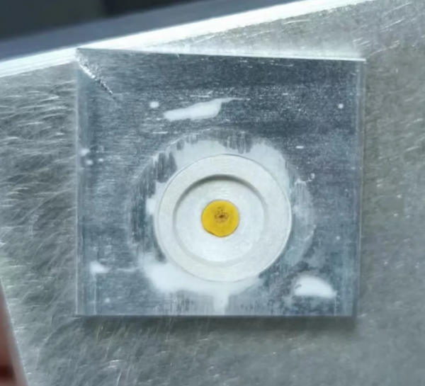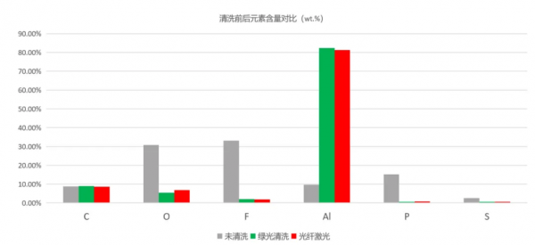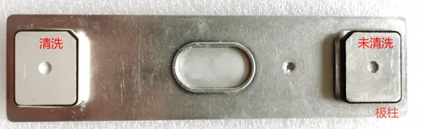 陽極塗層去除(10x30mm2 1.5s) 02 注液孔電解液清洗 電解液清洗的主要工序在動力電池注液後,密封釘焊接前;為(wei) 了保證良好的焊接效果需要在焊前對注液口上殘留的電解液去除。目前市麵主要采用光纖紅外激光避開密封釘進行清洗,存在膠釘易熔且有電解液殘留等問題,後續焊接電解液受熱易揮發,影響焊接效果。光至科技不僅(jin) 提供先進的光纖紅外MOPA激光器,更推出了100~200W光纖綠光激光器,采用綠光對注液孔整麵清洗,基本無殘留,膠釘影響較小。 動力電池方殼頂蓋 綠光清洗效果 光纖清洗效果 03 極柱氧化層清洗