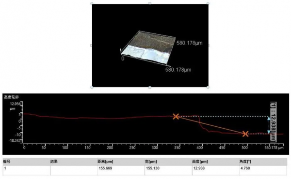 高能量單模塊1000W清洗脈衝(chong) 激光器支持方型/圓形光斑定製,具有5大技術特性:(1)自研自產(chan) 大模場增益光纖實現1kW平均功率,實現單模塊1000W脈衝(chong) 激光輸出;(2)最大單脈衝(chong) 能量提升至100mJ;(3)具有很強的抗高反能力,可垂直出光清洗高反材料;(4)最小脈寬可達20ns,用於(yu) 對熱效應有要求的領域;(5)BPP小於(yu) 25mm*mrad@400微米。可廣泛用於(yu) 光伏領域鈣鈦礦清邊、模具清洗,船舶、飛機等大型裝備除漆,除鏽;精密部件精確除漆;表麵粗糙化、毛化等;尤其是在新能源動力電池藍膜、藍漆清洗等領域具有明顯優(you) 勢。而進行光伏領域鈣鈦礦清邊應用一般采用方型光斑,工藝效果更好。(2)相較直接照射鈣鈦礦膜的方案,采用透過玻璃進行激光清洗的方式效果更佳在對鈣鈦礦進行清邊處理時,首先要確定基材表麵鈣鈦礦膜的厚度,為(wei) 後續的清洗參數確定提供參考,確保不會(hui) 由於(yu) 功率過小導致清洗後有殘留,也不會(hui) 使清洗激光功率過大損傷(shang) 基材,測試結果如下圖2所示,膜厚度約為(wei) 13μm。