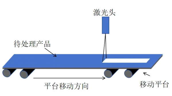 用相同的參數對鈣鈦礦正反表麵進行清洗效果測試,從(cong) 圖3中可見,兩(liang) 種清洗方案均能保證處理完後,基材表麵鈣鈦礦無殘留,且對玻璃基材沒有損傷(shang) ,但采用激光直接對鈣鈦礦膜進行清洗時,產(chan) 生的煙塵會(hui) 對激光產(chan) 生遮擋,甚至把基材玻璃熏黃。因此,相較而言采用透過玻璃對鈣鈦礦薄膜進行激光清洗的方式更為(wei) 合理且效果更佳。(3)銳科旗幟P1000H方型光斑激光器鈣鈦礦清邊工藝效果良好,達成客戶要求在實際生產(chan) 過程中,玻璃表麵鈣鈦礦導電膜的清邊方式如下圖4所示,其中激光器保持一條線連續出光,且位置不變,下方的傳(chuan) 送帶帶動需要清邊的鈣鈦礦樣品快速移動,將激光器掃描速度和平台移動速度相匹配,即可將線拓展成麵,快速完成對鈣鈦礦的清邊處理。
