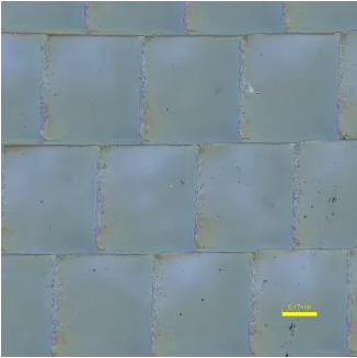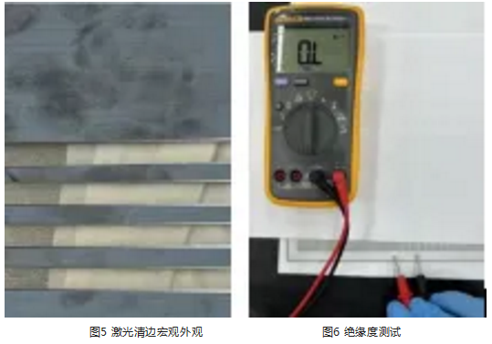 我們(men) 采用銳科旗幟P1000H方形光斑激光器,配置F170場鏡,平台移動速度可達到115mm/s,具體(ti) 清洗效果如下圖5所示,激光清洗後的玻璃表麵沒有鈣鈦礦鍍層殘留且較為(wei) 光亮,基材未受損,經過萬(wan) 用表測試,可證明其在經過清洗後表麵是絕緣的(圖6)。