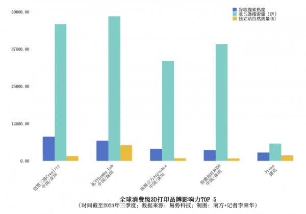 “過去幾年,深圳3D打印品牌正在全球崛起。”跨境品牌研究機構易勢創始人陳雄介紹,易勢通過分析穀歌搜索熱度、亞(ya) 馬遜搜索量、獨立站自然流量等數據發現,消費級3D打印企業(ye) 全球前5中有4家來自深圳,包含創想三維、拓竹、縱維立方、智能派。其中,創想三維在穀歌搜索熱度、亞(ya) 馬遜搜索量中領先其他三家深圳公司,而獨立站搜索量的前五排名數據中,拓竹一枝獨秀。相比而言,獨立站因為(wei) 跟商家聯係緊密,用戶黏性更強。