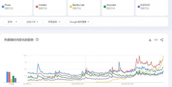 最近5年前5家企業(ye) 的穀歌搜索熱度值,拓竹後來居上。