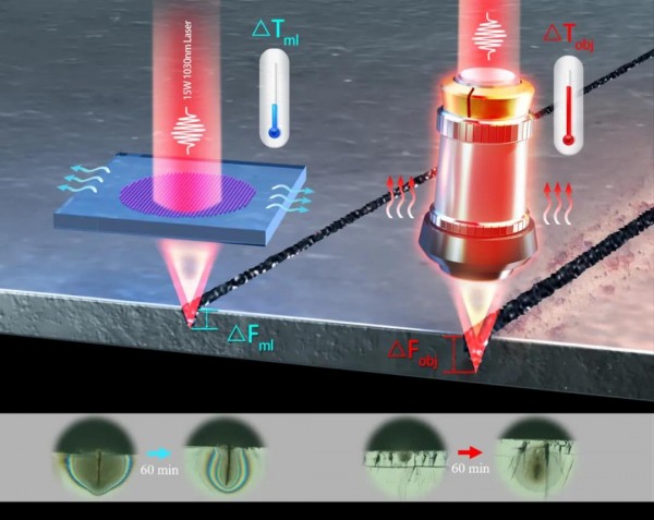 在激光加工中,精確的光束聚焦至關(guan) 重要。然而,由於(yu) 傳(chuan) 統物鏡材料熱導率較低,在高功率激光輻照下難以及時、有效地散熱,導致透鏡因熱應力發生形變或熔化,造成焦點漂移、光學性能下降,甚至不可逆的損壞。這種熱漂移問題不僅(jin) 影響加工精度,還限製了生產(chan) 效率和設備的可靠性。盡管可以采用冷卻裝置來緩解散熱問題,但其增加了係統的體(ti) 積、重量和成本,降低了器件的集成度和適用性。因此,迫切需要一種在高功率激光加工中既能抑製熱漂移,又能保持高光學性能和緊湊尺寸的新型光學器件。
